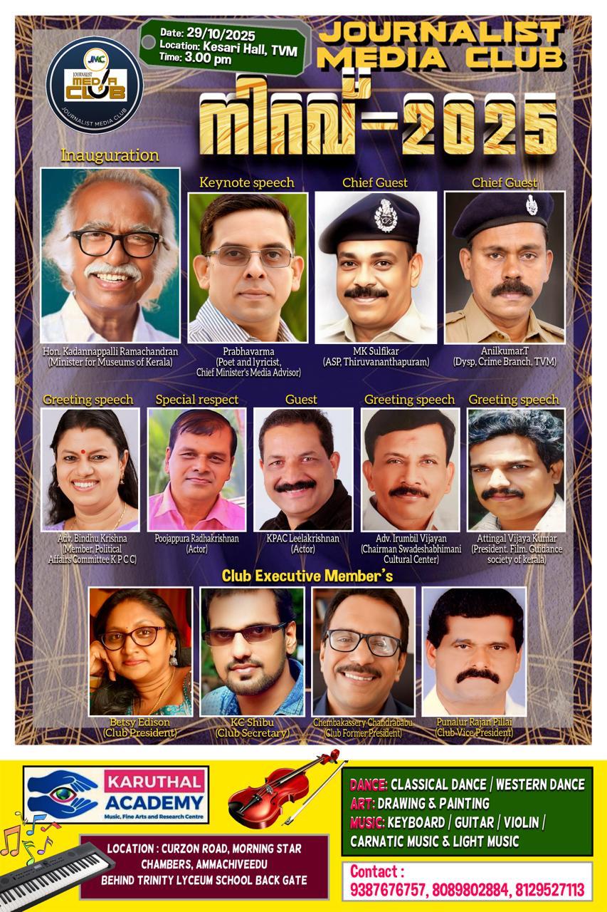 തിരുവനന്തപുരം :കേരള ജേർണലിസ്റ്റ് മീഡിയ നേതൃത്വത്തിൽ നിറവ് 2025 സംഘടിപ്പിക്കുന്നു.29/10/2025 ബുധനാഴ്ച്ച 3 മണിക്ക് ആണ് ചടങ്ങ്.രജിസ്ട്രേഷൻ പുരാവസ്തു വകുപ്പ് മന്ത്രി കടന്നപ്പള്ളി രാമചന്ദ്രൻ നിറവ് 2025ന്റെ…
