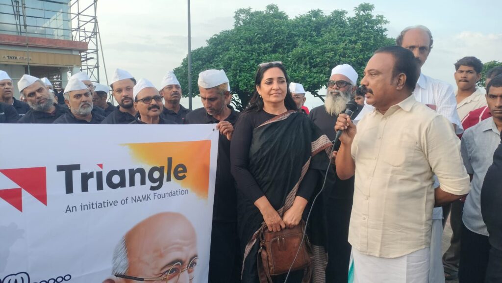 കോഴിക്കോട് : ട്രയാങ്കിൾ സാംസ്ക്കാരിക പ്രവർത്തകരും മറ്റ് സന്നദ്ധ സംഘടനകളുടെ ഭാരവാഹികളും റാലിയിൽ അണിനിരന്നത്. ഗാന്ധിയൻ ആദർശങ്ങളെ മറന്ന രാഷ്ട്രീയ നേതൃത്വങ്ങളോടുള്ള പ്രതിഷേധ സൂചകമായി കറുത്ത വസ്ത്രം അണിഞ്ഞാണ് പ്രവർത്തകർ സംഗമത്തിൽ പങ്കെടുത്തത്.