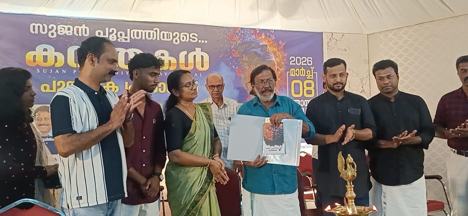 മാള :അകാലത്തിൽ പിരിഞ്ഞ അഛന്റെ ആഗ്രഹമായിരുന്ന പുസ്തകം പ്രകാശനത്തിന് തയ്യാറായപ്പോൾ കവിതകൾക്ക് അനുയോജ്യമായ ചിത്രങ്ങൾ വരച്ച് മക്കൾ. വെള്ളാങ്ങല്ലൂർ പഞ്ചായത്ത് അസിസ്റ്റൻ്റ് സെക്രട്ടറിയും മൃദoഗ വിദ്വാനുമായിരുന്ന സുജൻ പൂപ്പത്തി 2025 ഒക്ടോബർ 28-നാണ് മരിച്ചത് . 2026 ഫെബ്രുവരി 28-ന് സർവീസിൽനിന്ന് വിരമിക്കുന്ന ദിവസം പുസ്തകമായി പ്രസിദ്ധീകരിക്കാനായി കാത്ത് വച്ച 43 കവിതകളുടെ സമാഹാരം ആണ് പ്രകാശനം ചെയ്തത്.കവിതകൾക്ക് അനുയോജ്യമായ ചിത്രങ്ങളാണ് മക്കളായ അഥീനയും ആദിത്യ നന്ദഗോപാലുo വരച്ചത് .സുജന്റെ ഓർമ്മകൾ നിറഞ്ഞ വേദിയേയും സദസ്സിനേയും സാക്ഷിയാക്കി കവി കുരീപ്പുഴ ശ്രീകുമാറിൽനിന്ന് സുജൻ പൂപ്പത്തിയുടെ ഭാര്യ കെ.ബി. രജനി പുസ്തകം ഏറ്റുവാങ്ങി. പുസ്തക പ്രകാശനച്ചടങ്ങിൽ വി.ആർ. സുനിൽകുമാർ എം.എൽ.എ., പൊയ്യ പഞ്ചായത്ത് പ്രസിഡന്റ് ഔസേപ്പച്ചൻ ജോസ്, ഡോ. സി. രാവുണ്ണി, അശോകൻ ചരുവിൽ, ഡോ. ആർ.എൽ.വി. രാമകൃഷ്ണൻ, ഏങ്ങണ്ടിയൂർ ചന്ദ്രശേഖരൻ, പി. കെ. കിട്ടൻ,അന്നമ്മനട സുരേഷ്,അനിയൻ ആനാമ്പലത്, ഫാ :ജോണി കാഞ്ഞിരത്തിങ്കൽ തുടങ്ങിയവർ പങ്കെടുത്തു.സുജൻ പൂപ്പത്തിയുടെ സ്മരണയ്ക്കായി സംസ്ഥാനതലത്തിൽ നടത്തിയ കവിതാ രചനാമത്സരത്തിൽ വിജയിച്ചവർക്ക് പുരസ്കാരങ്ങൾ വിതരണം ചെയ്തു.
