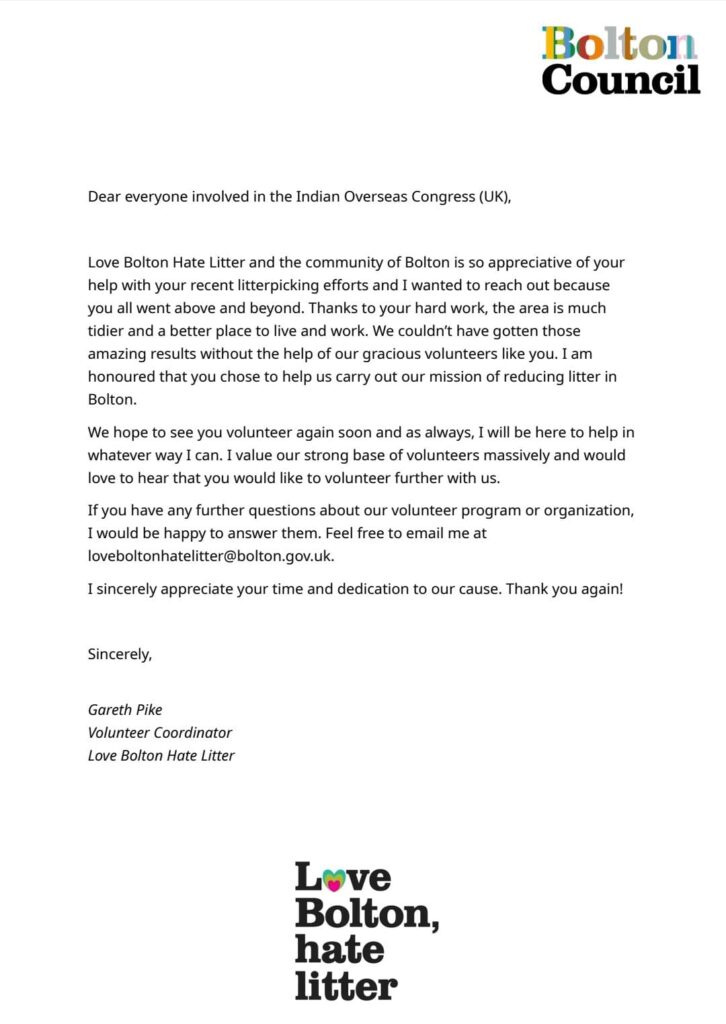 ബോൾട്ടൻ: ഗാന്ധിജയന്തി ദിനത്തിൽ ബോൾട്ടൻ ചിൽഡ്രൻസ് പാർക്കിൽ ഐ ഓ സി (യു കെ) – കേരള ചാപ്റ്റർ മിഡ്ലാൻഡ്സ് ഏരിയയുടെ ആഭിമുഖ്യത്തിൽ സംഘടിപ്പിച്ചതെരുവ് ശുചീകരണത്തിൽ പങ്കാളികളായ 22 വോളന്റിയർമാർക്ക് ബോൾട്ടൻ കൗൺസിലിന്റെ അഭിന്ദനം. ബോൾട്ടനിലെ തെരുവ് ശുചീകരണവുമായി ബന്ധപ്പെട്ട് കൗൺസിലിന്റെ കീഴിൽ പ്രവർത്തിക്കുന്ന ‘ലവ് ബോൾട്ടൻ, ഹേറ്റ് ലിറ്റർ’ സംവിദാനത്തിന്റെ മേൽനോട്ടവും ചുമതലയും വഹിക്കുന്ന ഉദ്യോഗസ്ഥനായ (വോളന്റീയർ കോർഡിനേറ്റർ) ഗാരത്ത് പൈക്കാണ് സേവാ ദിനത്തിന്റെ ഭാഗമായ ഐ ഓ സി വോളന്റിയർമാരെ അഭിനന്ദിച്ചുകൊണ്ടുള്ള കത്ത് കൈമാറിയത്. ഐ ഓ സിയുടെ വനിതാ – യുവജന പ്രവർത്തകരടക്കം 22 ‘സേവ വോളന്റിയർ’മാരാണ് ശുചീകരണ പ്രവർത്തനങ്ങളിൽ പങ്കെടുത്തത്.ഇവിടത്തെ തദ്ദേശ്ലീയരുടെയും മാധ്യമ പ്രവർത്തകരുടെയും പ്രശംസ പിടിച്ചു പറ്റിയിരുന്നു. സമൂഹത്തോടുള്ള പ്രതിബദ്ധതയും ജീവിക്കുന്ന ചുറ്റുപാടുകൾ ശുചിയായി സൂക്ഷിക്കുന്നതിനുള്ള ഉത്തരവാദിത്വം ഏറ്റെടുക്കുന്നതിൽ ഒരു ഇന്ത്യൻ സംഘടന കാണിച്ച മാതൃകാപരമായ പ്രവർത്തിയായാണ് ഐ ഓ സി (യു കെ) – കേരള ചാപ്റ്റർ മിഡ്ലാൻഡ്സ് ഏരിയയുടെ നേതൃത്വത്തിൽ, സംഘടിപ്പിക്കപ്പെട്ട തെരുവ് ശുചീകരണത്തെ തദ്ദേശീയർ ഉൾപ്പടെയുള്ള ജനങ്ങൾ നോക്കിക്കണ്ടത്.ബോൾട്ടൻ സൗത്ത് & വാക്ക്ഡൻ എം പി യാസ്മിൻ ഖുറേഷിയാണ് സേവന ദിനത്തിന്റെയും അതിനോടനുബന്ധിച്ചു സംഘടിപ്പിച്ച ‘സർവോദയ ലഹരി വിരുദ്ധ ക്യാമ്പയിനി’ന്റെയും ഔദ്യോഗികമായ ഉദ്ഘാടനം നിർവഹിച്ചത്. തന്റെ ഔദ്യോഗിക സോഷ്യൽ മീഡിയ അക്കൗണ്ടയ എക്സിൽ സേവനദിനത്തിന്റെ ഫോട്ടോയും അവർ പങ്കു വച്ചിരുന്നു. വോളന്റിയർമാരെ ആദരിച്ചുകൊണ്ടുള്ള സർട്ടിഫിക്കറ്റുകളുടെ വിതരണവും എംപി നിർവഹിച്ചു.ഐ ഓ സി (യു കെ) – കേരള ചാപ്റ്റർ പ്രസിഡന്റ് ഷൈനു ക്ലെയർ മാത്യൂസ്, ഐ ഓ സി (യു കെ) – കേരള ചാപ്റ്റർ ജനറൽ സെക്രട്ടറി റോമി കുര്യാക്കോസ് എന്നിവരുടെ നേതൃത്വത്തിൽ സംഘടിപ്പിച്ച ‘സേവന ദിന’ത്തിൽ ജിപ്സൺ ഫിലിപ്പ് ജോർജ്, അരുൺ ഫിലിപ്പോസ്, ഫിലിപ്പ് കൊച്ചിട്ടി, റീന റോമി, രഞ്ജിത്കുമാർ കെ വി, ജേക്കബ് വർഗീസ്, ഫ്രബിൻ ഫ്രാൻസിസ്, ബേബി ലൂക്കോസ്, സോജൻ ജോസ്, റോബിൻ ലൂയിസ്, അമൽ മാത്യു, ചിന്നു കെ ജെ, പ്രണാദ് പി പി, ജോയേഷ് ആന്റണി, ജസ്റ്റിൻ ജേക്കബ്, ബിന്ദു ഫിലിപ്പ്, അനഘ ജോസ്, ലൗലി പി ഡി, സ്കാനിയ റോബിൻ, സോബി കുരുവിള എന്നിവരാണ് സേവനദിനത്തിന്റെ ഭാഗമായത്.