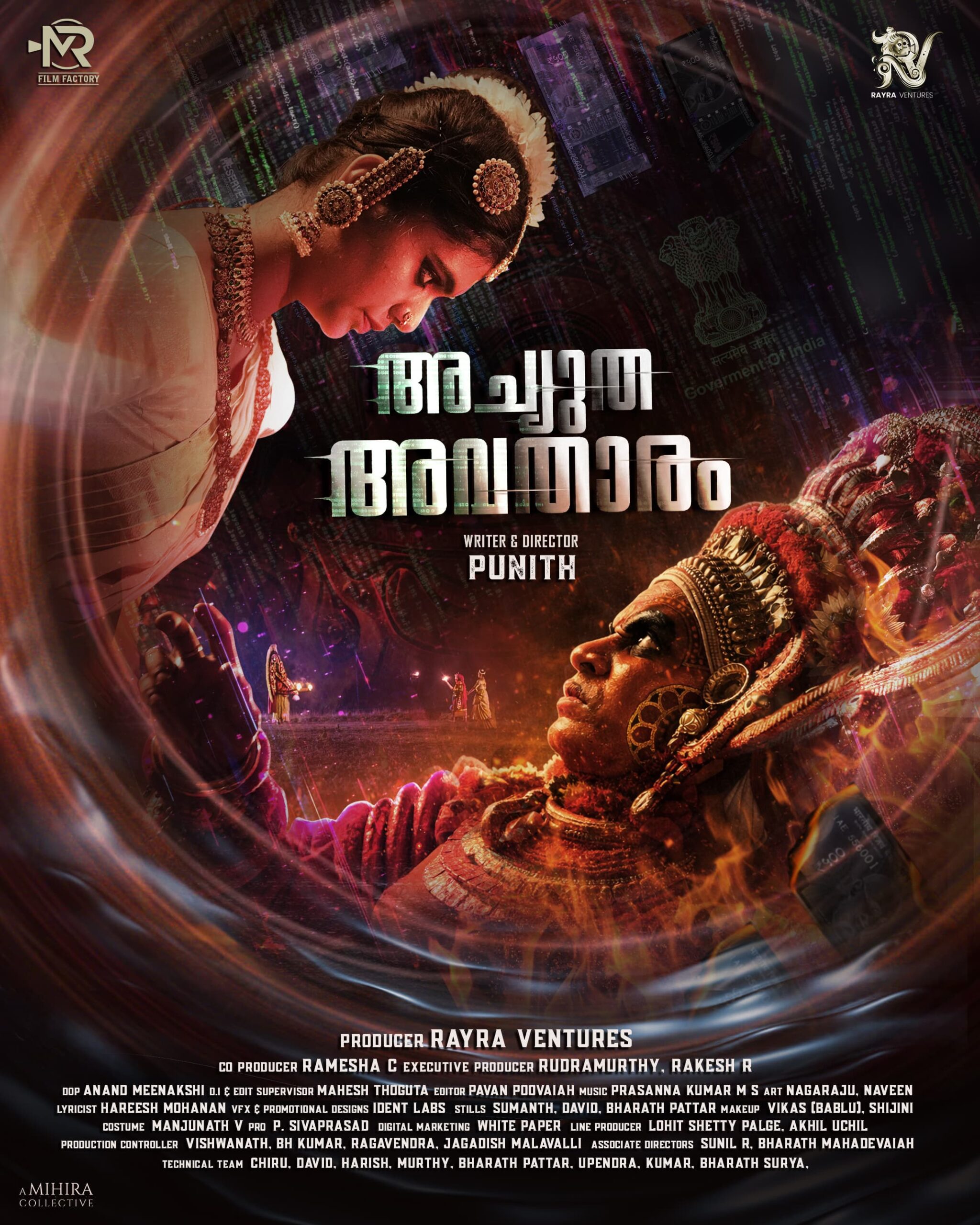 “കനലിൽ ആടിത്തിമിർക്കുന്ന തീച്ചാമുണ്ഡി തെയ്യം പോലെ… എരിയുന്ന തീയിലേക്ക് ശാന്തമായി നൃത്തമാടുന്ന പോലെ… തുളുനാടൻ വിശ്വാസത്തിന്റെ തീച്ചൂളകളിൽനിനിന്നും കന്നഡയിലെ പ്രമുഖ ചലച്ചിത്ര പ്രവർത്തകനും എഴുത്തുകാരനുമായ പുനിത് എന്ന നവാഗതൻ സംവിധായകൻ ഊതിക്കാച്ചിയെടുത്ത മലയാളത്തിൻ്റെ ദൃശ്യവിസ്മയമാവും ‘അച്യുത അവതാരം’ ” നിർമ്മാതാക്കളുടെ വാക്കുകളിൽ. റെയ്റ വെഞ്ചേഴ്സിന്റെ ബാനറിൽ രമേശ സി, രുദ്രമൂർത്തി,രാജേഷ് ആർ എന്നിവർ ചേർന്ന് നിർമിക്കുന്ന പുതിയ ചിത്രമാണ് ‘അച്യുത അവതാരം’. സൈബർ-ത്രില്ലർ ഗണത്തിൽ വരുന്ന ഈ ചിത്രത്തിൻ്റെ ഫസ്റ്റ്ലുക്ക് പോസ്റ്റർ റിലീസ് ആയി. നവാഗത സംവിധായകനായ പുനീത് തന്നെയാണ് ചിത്രത്തിൻ്റെ തിരക്കഥ. വർഷങ്ങളായി തെലുങ്ക്, തമിഴ് ചലച്ചിത്രങ്ങളിൽ അസോസിയേറ്റ് ഡയറക്ടർ ആയിരുന്ന പുനീതിൻ്റെ ആദ്യ സംവിധാന സംരംഭമാണ് അച്യുത അവതാരം. പ്രമുഖ നർത്തകിയും താരവുമായ മാളവിക നന്ദൻ, അവിനാശ് (കാന്താര ഫെയിം), സീമ ജി. നായർ എന്നിവർക്കൊപ്പം അന്യഭാഷ താരങ്ങളും ചിത്രത്തിൽ വേഷമിടുന്നു. ദേശീയ അവാർഡ് ജേതാവായ ഛായാഗ്രാഹകൻ ആനന്ദ് മീനാക്ഷിയാണ് ചിത്രിൽ ക്യാമറ കൈകാര്യം ചെയ്യുന്നത്. കാസർകോടും മറ്റുമായി ചിത്രീകരണം പൂർത്തിയാക്കിയ ചിത്രം മെയ് മാസത്തോടെ തിയേറ്ററുകളിൽ എത്തും. ഹരീഷ് മോഹനൻ്റെ വരികൾക്ക് പ്രസന്ന കുമാർ എം.എസ് ആണ് സംഗീതം നൽകിയിരിക്കുന്നത്. എഡിറ്റിംഗ്: പവൻ പൂവയ്യ & മഹേഷ് തോട്ട, ആർട്ട്: നാഗരാജു, നവീൻ, വി. എഫ്.എക്സ്: ഐഡൻ്റ് ലാബ്സ്, ഡിജിറ്റൽ മാർക്കറ്റിംഗ്: വൈറ്റ് പേപ്പർ, പി.ആർ.ഓ: പി. ശിവപ്രസാദ് എന്നിവരാണ് മറ്റ് അണിയറ പ്രവർത്തകർ.