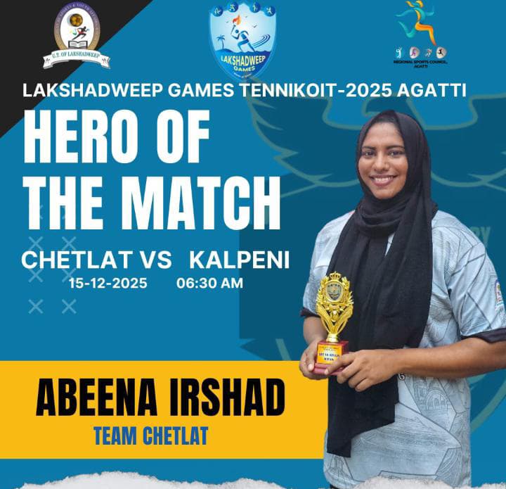 അഗത്തി: ഇവിടെ നടന്നുവരുന്ന ലക്ഷദ്വീപ് ഗെയിംസ് 2025 ലെ ടെന്നിക്കോയിറ്റ് മത്സരത്തിൽ അബീന ഇർഷാദിനെ മികച്ച കളിക്കാരിയായി തെരഞ്ഞെടുത്തു. ഇന്ന് രാവിലെ കൽപേനി ടീമുമായി നടന്ന വാശിയേറിയ മത്സരത്തിൽ കളിക്കളത്തിലെ ഹീറോ ആയി കാണികളെ ആവേശം കൊള്ളിച്ച അവരെ സംഘാടകർ അവാഡ് നൽകി ആദരിക്കയും ചെയ്തു. ചെത്ത്ലത്ത് ദ്വീപ് സ്വദേശിയായ അവർ ഇക്കഴിഞ്ഞ ലക്ഷദ്വീപുതല ബാഡ്മിന്റൺ മത്സരത്തിലും റണ്ണറപ്പായിരുന്നു. കായിക രംഗത്ത് വളർന്ന് വരുന്ന ഒരു പ്രതിഭ കൂടിയാണ് അബീന ഇർഷാദ്.ചെറിയ ബംഗ്ലാവ് ഇർഷാദിന്റേയും ചെറിയ പുര അസ്മാബിയുടേയും മകളാണ് ഈ കായികതാരം