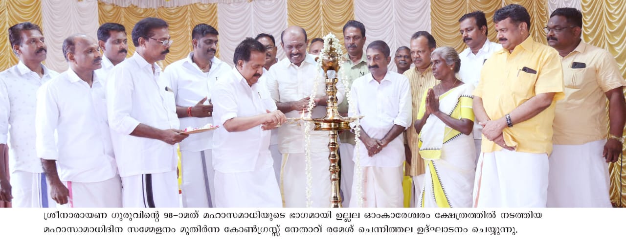 വൈക്കം: ശ്രീനാരായണ ഗുരുദേവന്റെ ദര്ശനങ്ങളും സന്ദേശങ്ങളും ലോകമെങ്ങും ശ്രദ്ധേയമാണ്. ജനങ്ങളുടെ മോചനവും, സ്വാതന്ത്യവും, ഐക്യവും, സമാധാനവും, പുരോഗതിയുമാണ് ഗുരുദേവ സന്ദേശങ്ങളുടെ കാതലെന്നും, അത്തരം ചിന്തകളെ മതവല്ക്കരിക്കുവാന് ശ്രമിക്കരുതെന്നും മുതിര്ന്ന കോണ്ഗ്രസ്സ് നേതാവ് രമേശ് ചെന്നിത്തല പറഞ്ഞു.ശ്രീനാരായണ ഗുരുവിന്റെ 98-ാമത് മഹാസമാധിയുടെ ഭാഗമായി ഉല്ലല ഓംകാരേശ്വരം ക്ഷേത്രത്തില് നടത്തിയ മഹാസമാധിദിന സമ്മേളനം ഉദ്ഘാടനം ചെയ്യുകയായിരുന്നു രമേശ് ചെന്നിത്തല. ക്ഷേത്രം ഓഡിറ്റോറിയത്തില് നടന്ന സമ്മേളനത്തില് ക്ഷേത്രം പ്രസിഡന്റ് പി.വി. ബിനേഷ് അദ്ധ്യക്ഷത വഹിച്ചു. യൂണിയന് സെക്രട്ടറി എം.പി. സെന്, ക്ഷേത്രം സെക്രട്ടറി കെ.വി. പ്രസന്നന്, ആചാര്യ തങ്കമ്മ മോഹനന്, സി.കെ. നാരായണ ദാസ്, ഭാരവാഹികളായ റ്റി.പി. സുഖലാല്, വി.ഡി. സന്തോഷ്, എന്.എന്. പവനന്, കെ. സാജു, പി.ആര്. തിരുമേനി, കെ.കെ. അജേന്ദ്രന്, കെ.എസ്. സിദ്ധാര്ത്ഥന്, കെ.എസ്. പ്രീജു, പി.ആര്. ബിജു, കെ.എസ്. ബൈജു, റ്റി.വി. ബിജു എന്നിവര് പ്രസംഗിച്ചു.ചിത്രവിവരണം- ശ്രീനാരായണ ഗുരുവിന്റെ 98-ാമത് മഹാസമാധി