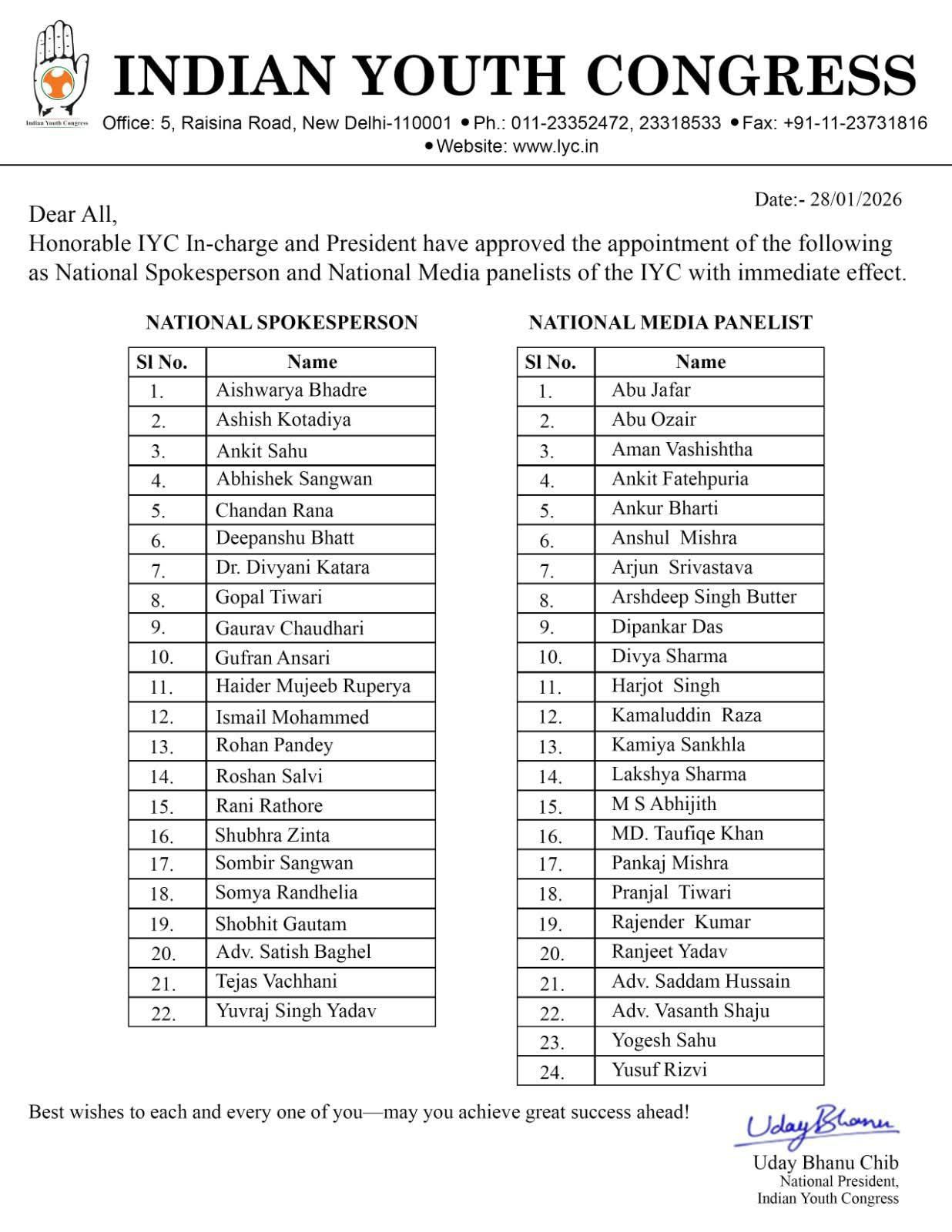 അഖിലേന്ത്യ വക്താക്കളെ പ്രഖ്യാപിച്ച് യൂത്ത് കോൺഗ്രസ് കേരളത്തിൽ നിന്നും അഡ്വ വസന്ത് സിറിയക്കും എംഎസ് അഭിജിത്തും
