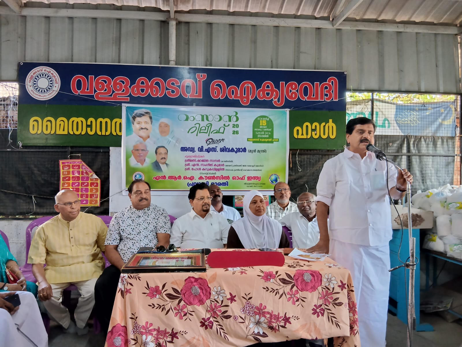 പ്രവാസി ഭാരതിയും എൻ.ആർ.ഐ. കൗൺസിൽ ഓഫ് ഇന്ത്യയും നടത്തിയ റംസാൻ റിലീഫ് – 2026 300 പേർക്കു ഭക്ഷ്യധാന്യക്കിറ്റ് നൽകിതിരു: മതങ്ങൾ തമ്മിൽ ഉണ്ടാകുന്ന വൈരുദ്ധ്യങ്ങൾക്ക് വിരാമമിടാനുള്ള സമയം അതിക്രമിച്ചിരിക്കുകയാണെന്ന സന്ദേശം വിളംബരം ചെയ്യുന്ന മത സൗഹാർദ്ദത്തിന്റെ പ്രതീകമാണ് റംസാൻ മാസമെന്നു മുൻ മന്ത്രി അഡ്വ.വി.എസ് ശിവകുമാർ പ്രസ്താവിച്ചു. പ്രവാസി ഭാരതിയും എൻ.ആർ.ഐ. കൗൺസിലും നടത്തിയ റംസാൻ റിലീഫ് സംഗമംവള്ളക്കടവ് ഐക്യ വേദി ഹാളിൽ ഇന്നു വൈകിട്ട് മൂന്നു മണിക്ക് ഉദ്ഘാടനം ചെയ്തു സംസാരിക്കുകയായിരുന്നു അഡ്വ.വി.എസ്.ശിവകുമാർ . സഹിഷ്ണതയും സമാധാനവും ശാന്തതയും സർവ്വോപരി സഹായങ്ങളും സഹജർക്ക് നൽകണമെന്നു ഉദ്ബോധിപ്പിക്കുന്ന പുണ്യമായ റംസാൻ മാസത്തിൽ അന്നത്തിനു വക നൽകി സഹകരിക്കുന്നത് ഏറ്റവും പുണ്യ സൽക്കർമ്മമാണെന്നു ചടങ്ങിൽ പങ്കെടുത്ത പ്ര മുഖ വ്യക്തികൾ പ്രസ്താവിച്ചു. കൗൺസിൽ സീനിയർ വൈസ് ചെയർമാൻ ശശി ആർ നായർ അ അദ്ധ്യക്ഷത വഹിച്ചു.