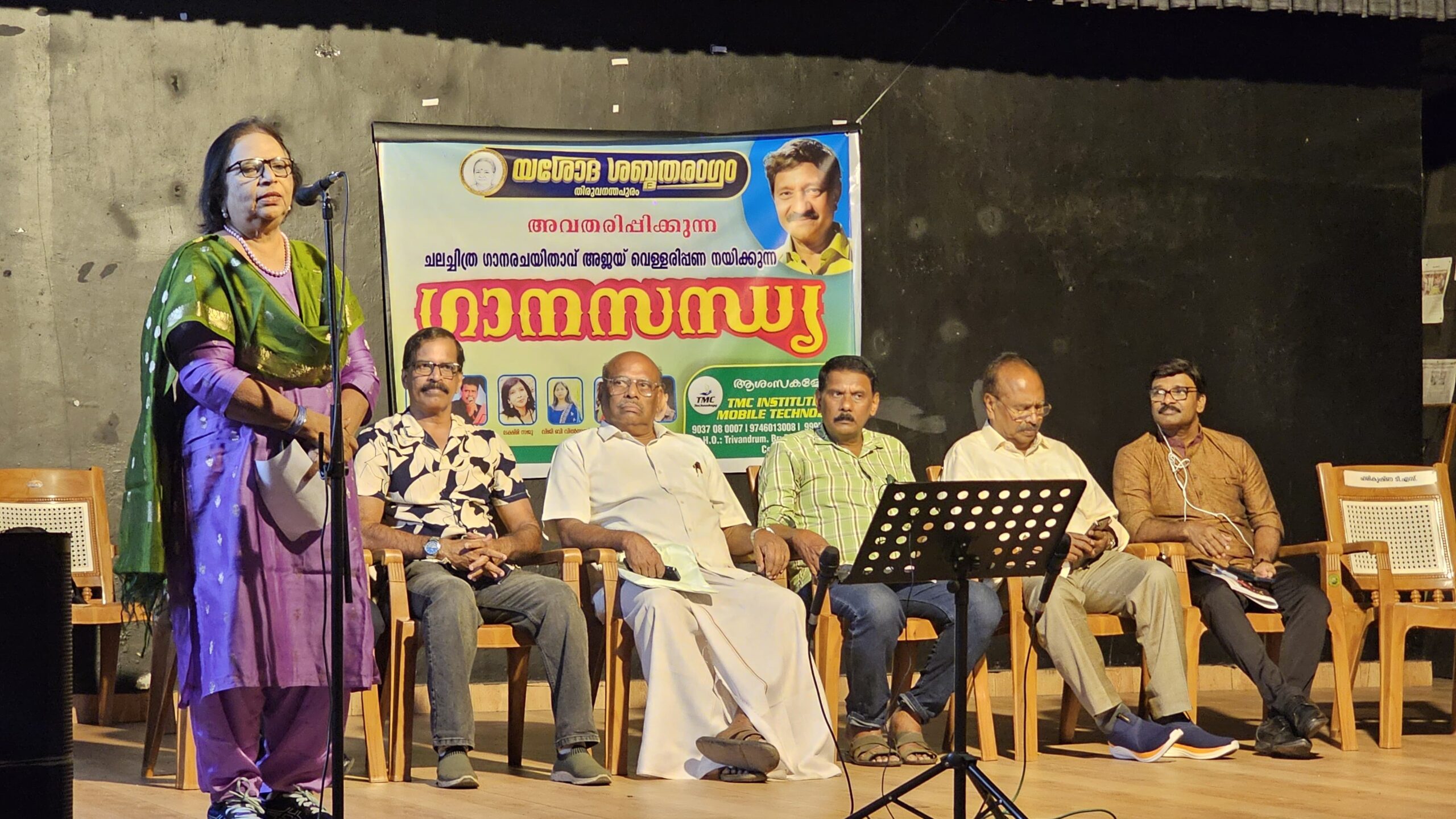 തിരു : ചലച്ചിത്ര ഗാന രചയിതാവും സംഗീതജ്ഞനുമായ അജയ് വെള്ളരിപ്പണയുടെ നേതൃത്വത്തിൽ യശോധ ശബ്ദ തരംഗം തൈക്കാട് ഭാരത് ഭവൻ മണ്ണരങ്ങിൽ സിനിമ പിന്നണി ഗായകരുടെ നേതൃത്വത്തിൽ ഗാനസന്ധ്യ നടത്തി .മതമൈത്രി സംഗീതജ്ഞൻ ഡോ. വാഴമുട്ടം ചന്ദ്രബാബു 935 മത് മതമൈത്രി സംഗീത പ്രോഗ്രാം അവതരിപ്പിച്ചു. പ്രേംനസീർ സുഹൃത് സമിതി പ്രസിഡണ്ട് പനച്ചമൂട് ഷാജഹാന്റെ അദ്ധ്യക്ഷതയിൽ ഗാനരചയിതാവും നോവലിസ്റ്റുമായ ഷംസ് ആബ്ദീൻ ഉദ്ഘാടനം ചെയ്തു.ചലച്ചിത്ര സംവിധായകൻ ജോളി മസ്സ്, ഫിലിം പി ആർ ഓ അജയ് തുണ്ടത്തിൽ, വ്യാപാരി വ്യവസായി സമിതി മുൻ സംസ്ഥാന പ്രസിഡണ്ടും ശബ്ദ തരംഗം മാസിക മാനേജിങ് എഡിറ്ററുമായ റഹീം ബാലരാമപുരം,എം. കെ.സൈനുൽ ആബ്ദീൻ എന്നിവർ പ്രസംഗിച്ചു. രാധിക എം നായർ രമേശ് തൈക്കാട്,സമീർ കെ തങ്ങൾ,വിഴിഞ്ഞം ഷാജത്ത്,ശ്രീജിത്ത് എം. നായർ,അനഘ, നൂറുൽ ഹസൻ തുടങ്ങിയവർ നാലുമണിക്കൂർ നീണ്ടുനിന്ന ഗാനമേള നടത്തി.
