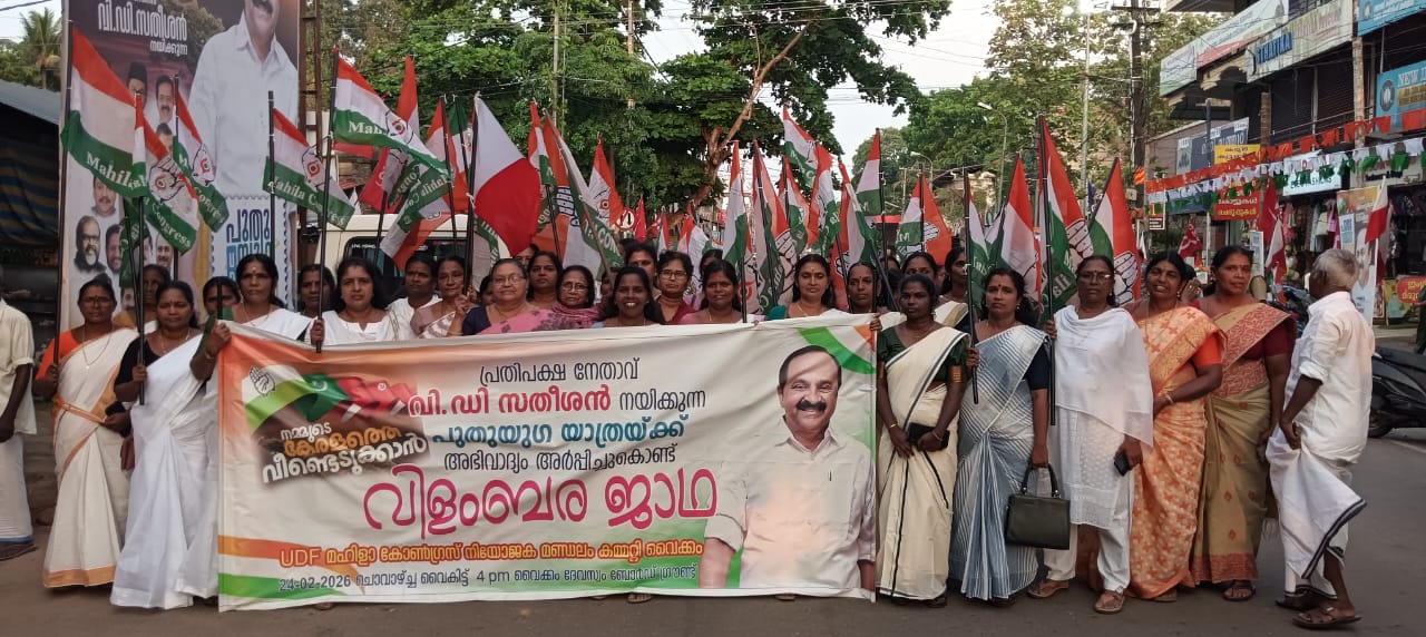വൈക്കം: പ്രതിപക്ഷനേതാവ് വി.ഡി. സതീശൻനയിക്കുന്ന പുതുയുഗയാത്രയെ സത്യാഗ്രഹസമരഭൂമിയിലേക്ക് സ്വീകരിക്കുന്നതിൻ്റെഭാഗമായി വിവിധ സംഘടനകളുടെ നേതൃത്വത്തിൽ ടൗണിൽ വിളംബര ജാഥകളും ബൈക്ക് റാലികളും നടത്തി.. മഹിളാ കോൺഗ്രസ് പ്രവർത്തകരുടെനേതൃത്വത്തിൽ നടത്തിയ വിളംബര ജാഥയ്ക്ക് ബ്ലോക്ക് പഞ്ചായത്ത് പ്രസിഡൻ്റ് തങ്കമ്മ വർഗ്ഗീസ് അധ്യക്ഷം വഹിച്ചു. മഹിളാ കോൺഗ്രസ്സ സ്ഥാനസെക്രട്ടറി വിജയമ്മ ബാബു, ബ്ലോക്ക് പ്രസിഡൻ്റുമാരായ ഷീജ ഹരിദാസ്, കുമാരി കരുണാകരൻ,ലീഗ് മെമ്പർകെ.എസ് ചന്ദ്രിക, നഗരസഭാ വൈസ് ചെയർപേഴ്സൺ സൗദാമിനി അഭിലാഷ്, പ്രീതാ രാജേഷ്, രേണുകാ രതീഷ്,രാജശ്രീ വേണുഗോപാൽ, നിർമ്മലമാർട്ടിൻ, മിനി ബെന്നി, തുടങ്ങിയവർ നേതൃത്വം നൽകി.കേരള സർവ്വീസ് പെൻഷണേഴ്സ് അസ്സോസ്സിയേഷൻ്റെ നേതൃത്വത്തിൽ വെച്ചൂരിൽ നിന്നും ആരംഭിച്ച വിളംബര ബൈക്ക് ജാഥ ജില്ലാ പ്രസിഡൻ്റ് പി.ജെ.ആൻ്റണി ഫ്ലാഗ് ഓഫ് ചെയ്തു. പ്രസിഡൻ്റ് പി. ഐ പ്രതീപ് കുമാർ അധ്യക്ഷതവഹിച്ചു. ജില്ലാ നേതാക്കളായ പി.കെ. മണിലാൽ, ഗിരിജാ നായർ, ഹർഷകുമാർ, പി.വി.സുരേന്ദ്രൻ, ശ്രീരാമ ചന്ദ്രൻ, സുരേഷ്കുമാർ, സി. അജയകുമാർ തുടങ്ങിയവർ നേതൃത്വം നൽകി.യൂത്ത് കോൺഗ്രസ് നിയോജക മണ്ഡലം കമ്മറ്റിയുടെ നേതൃത്വത്തിൽ തലയോലപ്പറമ്പിൽ നിന്നും വൈക്കത്തേക്ക് വിളംബര ബൈക്ക് റാലി നടത്തി. നിയോജക മണ്ഡലം പ്രസിഡൻ്റ് സീതുശശിധരൻ്റെ അധ്യക്ഷതയിൽ ആരംഭിച്ച റാലി ശശിധരൻ വാളവേലിൽ ഫ്ലാഗ് ഓഫ് ചെയ്തു. പി.കെ. ജയപ്രകാശ്, മോനു ഹരിദാസ്, കെ.കെ. കൃഷ്ണകുമാർ,അഭിജിത്ത് ദിലീപ്, അമൽ ജോൺ, സിറിൾ സിറിയക്ക് തുടങ്ങിയവർ നേതൃത്വം നൽകി.പുതു യുഗ യാത്രയുടെ വിജയത്തിനായി യു.ഡി.ടി.എഫ് വിളംബര ജാഥ നടത്തി. വൈക്കം : പ്രതിപക്ഷ നേതാവ് വി.ഡി.സതീശൻ നയിക്കുന്ന പുതുയുഗ യാത്രയുടെ വിജയത്തിനായി യു.ഡി.എഫ് തൊഴിലാളി സംഘടനകളായ യു.ഡി ടി.എഫ്.. ഐ.എൻ.ടി.യു .സി തുടങ്ങിയ സംഘടനകളുടെ നേതൃത്വത്തിൽ കാട്ടിക്കുന്നിൽ നിന്നും വൈക്കത്തേക്ക് വിളംബര ജാഥ നടത്തി.വൈക്കത്ത് എത്തുന്ന പ്രതിപക്ഷ നേതാവിന്റെ ജാഥക്ക് തൊഴിലാളി സമൂഹത്തിന്റെ പിന്തുണ അറിയിച്ചാണ് ബൈക്ക് റാലി സംഘടിപ്പിച്ചത്. ഐ.എൻ.ടി.യു.സി നിയോജക മണ്ഡലം പ്രസിഡന്റ് അഡ്വ.പി.വി.സുരേന്ദ്രന്റെ നേതൃത്വത്തിൽ നടന്ന ജാഥ ഡി.സി.സി ജനറൽ സെക്രട്ടറി പി.വി.പ്രസാദ് ഫ്ലാഗ് ഓഫ് ചെയ്ത് ഉദ്ഘാടനം ചെയ്തു.. ഐ.എൻ.ടി.യു.സി സംസ്ഥാന സെക്രട്ടറി എം.വി. മനോജ് .. എസ്.ടി.യു സംസ്ഥാന വർക്കിo ഗ് കമ്മറ്റി അംഗം ഷാജി കാട്ടിക്കുന്ന് .. ചെമ്പ് ഗ്രാമ പഞ്ചായത്ത് പ്രസിഡന്റെ കെ.ജെ. സണ്ണി .ഐ.എൻ.ടി.യു.സി ജില്ലാ ഭാരവാഹികളായ ഇടവട്ടം ജയകുമാർ . യു ബേബി :. ജോർജ്ജ് വർഗ്ഗീസ് .. കെ.എൻ.. വേണുഗോപാൽ .. ടി.ആർ. ശശികുമാർ .. കെ.വി. ചിത്രാംഗദൻ ,.എം.ആർ. ഷാജി..ജീ.രാജീവ് . സി.എസ്.സലിം,. മോഹൻ .. കെ.തോട്ടു പുറം.. കെ.സുരേഷ് കുമാർ . വർഗ്ഗീസ് പുത്തൻചിറ . ടി.
