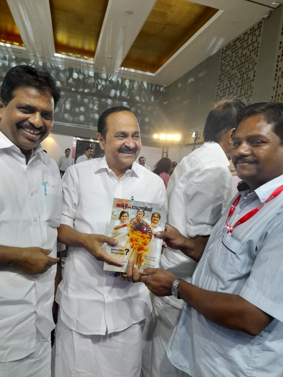 സിറ്റി വോയിസിന്റെ മാഗസീൻ സിറ്റി വോയിസ് റിപ്പോർട്ട്ർ എം ദൗലത് ഷാ പ്രതിപക്ഷ നേതാവ് വി ഡി സതീശന് നൽകി പ്രകാരനം ചെയ്യുന്നു. കൊടികുന്നിൽ സുരേഷ് എം പി സമീപം.