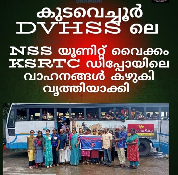 വെച്ചൂർ: സാമൂഹ്യസേവന പ്രവർത്തനങ്ങളുടെ ഭാഗമായി കുടവെച്ചൂർ ഡി.വി.എച്ച്.എസ്.എസ്.യിലെ എൻ.എസ്.എസ്. യൂണിറ്റ് അംഗങ്ങൾ വൈക്കം കെ.എസ്.ആർ.ടി.സി. ഡിപ്പോയിലെ ബസുകൾ കഴുകി വൃത്തിയാക്കി. വിദ്യാർത്ഥികളുടെ സജീവ പങ്കാളിത്തത്തോടെയാണ് ശുചീകരണ പ്രവർത്തനങ്ങൾ…